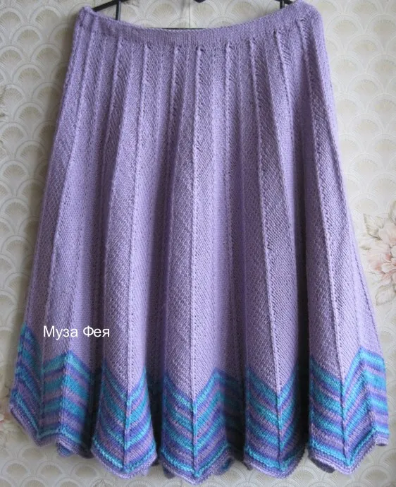 Полосу из секционки вязала сразу на всю юбку, чтобы совпадали цвета по бокам, а когда пряжа закончилась, перешла на сиреневую и вязала каждую половину юбки отдельно.