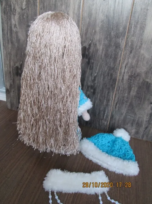 отделка - пряжа Минк, волосы - гарус, отделка - пришивные снежинки