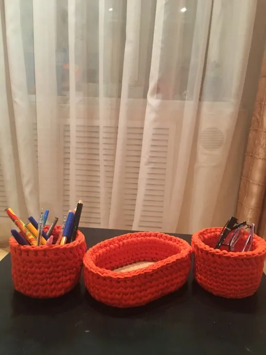 сегодня завершила работу над набором корзинок.Первый набор связан крючком из трикотажной пряжи. Второй набор связан из жгута.