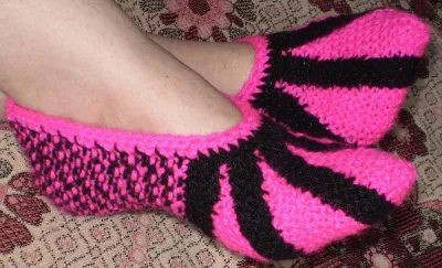 1 ряд нитью светлого цвета: кромочную провязать лиц, *1 лиц, 1 петлю снять (нить за петлей)*, повторять от* до*;2 ряд и все четные провязываем изнаночными петлями;3 ряд нитью темного цвета: кромочную провязать лицевой, *1 петлю снять (нить за петлей), 1 лиц.*, повоторять от * до *;5 ряд: повторять с 1 ряда.Провязываем таким образом заднюю часть тапочка необходимой длины в зависимости от нужного размера.Далее вяжем носочную часть.6 рядов платочной вязки темной нитью.Для лепестка:1 ряд: вяжем светлой нитью 9 лицевых петель с учетом кромочной, разворачиваем вязание и провязываем все четные ряды лицевыми петлями.3 ряд: провязываем 12 лицевых петель, разворачиваем вязание и эти 12 петель провязываем лицевыми петлями.5 ряд: провязываем 15 лицевых петель, разворачиваем вязание, и вяжем их лицевыми петлями.7 ряд: 18 лиц, разворачиваем и провязываем их лицевыми петлями.9 ряд: 15 лиц.11 ряд: 12 лиц.13 ряд: 9 лиц.Далее вяжем темной нитью 6 рядов платочной вязкой, провязывая все петли на спице.Связать 5 лепестков и далее вторую половину задней части.Получится такая заготовка.тапочки вязаные сшить