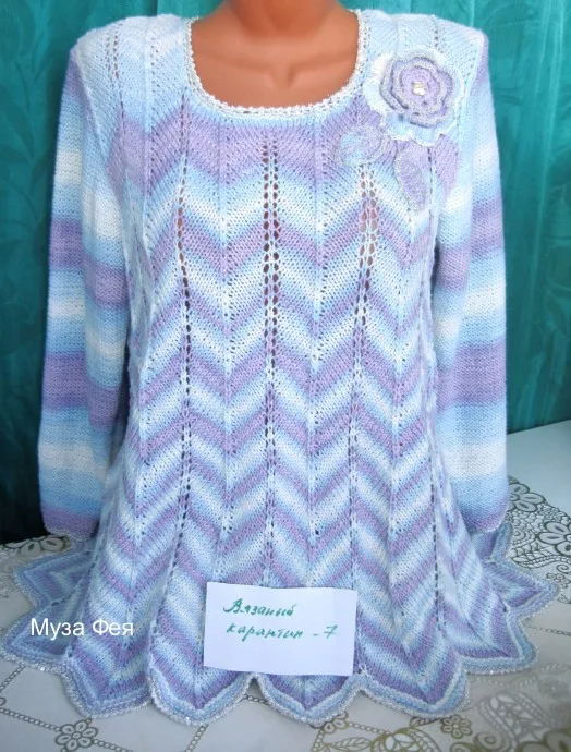 Отделка крючком пряжей двух видов в две нити, одна с люрексом, другая - с пайетками. Размер в груди - 49 -50см, ширина низа - 76см, длина изделия - 68см.