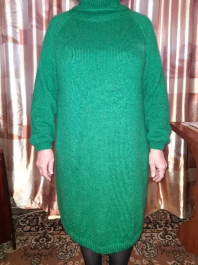Моё новое изделие теплое, мягенькое как котёнок платье модели оверсайз связано спицами из итальянской бобинной тонкой пряжи трех видов мохер, хлопок, полушерсть. Вязаное полотно лицевой глади очень нежное с легким пушком, совершенно не колкое. Платье связано без единого шва, рукав реглан. Ширина платья по груди 56см, по бедрам 62см, рукава 19 см, длина платья 95см, длина рукава 56см, воротник высокий, сложенный вдвое высотой 10 см. Размер как оверсайз подойдет на размеры 50— 54. К сожалению я очень далеко не модель и не фотограф, но как смогла, так и показала.