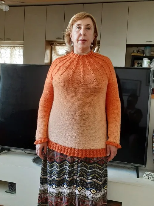Приветствую всех дорогих вязальщиц!!! Поделюсь еще двумя моими работами.Связала двум подругам аналогичные свитера по их просьбе.Им очень понравился свитер для Соль "Сиреневый туман"и попросили меня "повториться" и для них.Оба связаны из сегментированной пряжи-таракотовой и оранжевой.Подруги довольны. Всем здоровья и успехов!!!