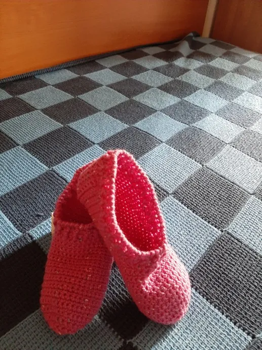 Учусь вязать тапочки крючком. Пряжа - разные остатки, по составу 50% шерсть, 50% акрил у розовых и серых. Пестренькие из Троицкой пряжи "Водопад", 70% шерсть и 30% капрон.