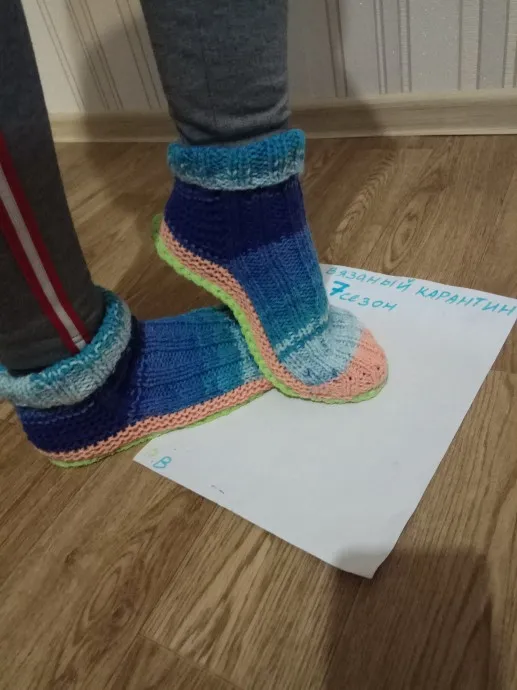 Верх из остатков пряжи. Вязала спицами. Подошва из остатков трикотажного полотна, нарезанного на полоски. Связана крючком. Получилась с массажным эффектом. Верх и подошву соединила крючком, не закрывая петли верха. Не знаю, как долго будет доча носить эти тапочки, но понравились.