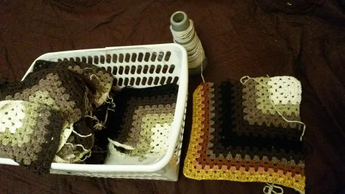 Вязала все квадраты олновременно-поэтапно, а не по одному полностью. В моем покрывале 56 квадратов - 7Х8.