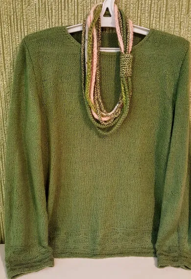 Здравствуйте все! Для начала немного о моей, более чем скромной работе - пуловер вязался для холодного времени года под куртку, поэтому никаких изысков и узоров. От него требовалось только одно - быть тёплым и тонким. Выбор пал на пряжу Ангора РАМ, цвет весенний для настроения в пасмурную и серую погоду. Ничем вас, дорогие мои, поразить не смогу, просто отчитываюсь о проделанной работе. Итак: пряжа ангора RAM, 100г/500м, 40%-мохер и 60%-акрил, спицы №4, на всё ушло грамм 250. Для куража связала на шею что-то типа украшения, но оно ещё и греет немножко. Спасибо всем, кто заглянул....