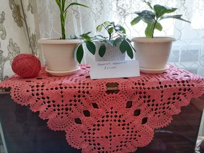 В прошлом конкурсе связала я одну салфетку под цветочный горшок. Но эту салфетку я задарила...а себе решила связать небольшую квадратную скатерть на стол-тумбу из 9 мотивов. На эту мысль натолкнула меня такой казус: моя белоснежная салфетка, лежащая на этой тумбе под цветочным горшочком оказалась пожелтевшей. По видимому перелила воды в горшок, салфетка промокла, а я сразу не заметила...Итог- желтое пятно.... Тогда я решила связать вот такую из толстой х/б пряжи и не белую... Расход 430 гр, крючок 3,0 Нитки еще остались... Свяжу еще под телевизор дорожку из 6 мотивов. Если хватит, то такую же из 9...., чтобы тоже углом лежала на тумбе..