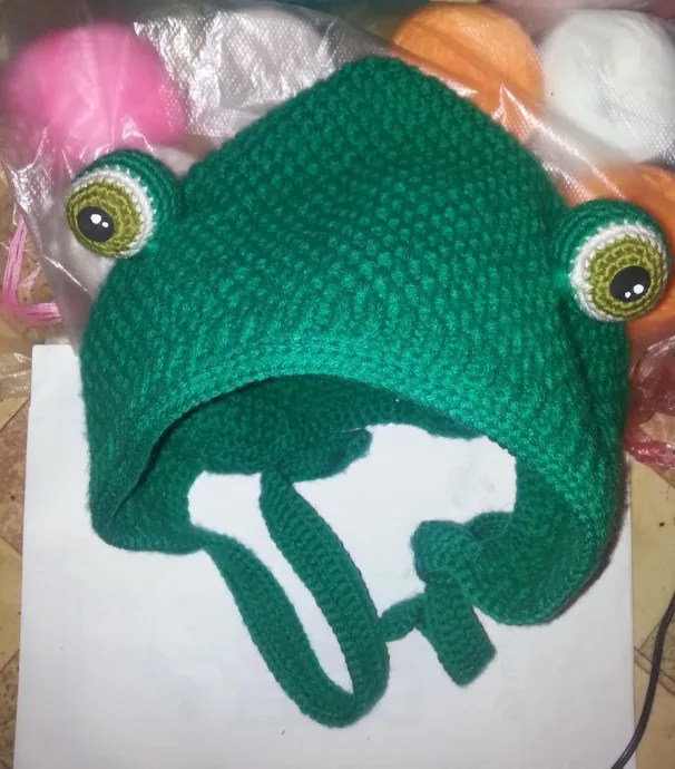 По просьбе племянницы: моя Анюта где-то на китайских просторах наткнулась на такую смешную шапку-лягушку, а в продаже таких шапок не нашла.. (Фото на которые ориентировалась добавлю в самом конце).