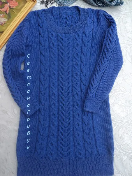 Платье василькового цвета спицами