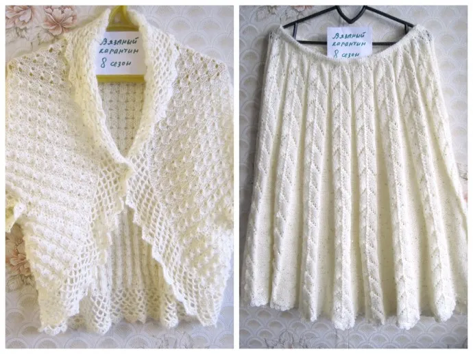 Длина юбки - 70см. Болеро - 46-48 размер. Спицы №3,5, отделка крючком №3 - низ юбки и край болеро, сеточка с зубчиками. Болеро представляет собой прямоугольник 90х 65см.