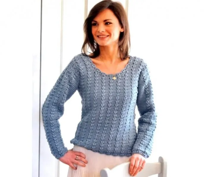 Сборка: сшить правое плечо. Обвязать горловину каймой.