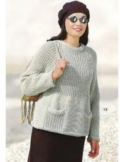 Сборка: выполнить швы реглана; гю вырезу горловины набрать на круговые спицы 62 п. и связать 3 см = 6 круговых рядов изнаночной гладью, все петли закрыть. Выполнить боковые швы и швы рукавов. Пришить мешковины карманов.