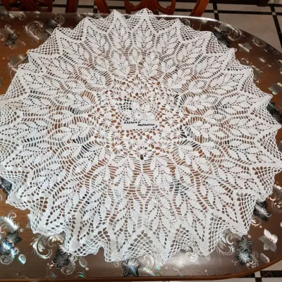 Скатерть связана на заказ крючком. Диаметр скатерти 145 см. Использована Семеновская пряжа Кабле 430 м/100 г., расход более 5 мотков. Вязала 2 недели. Не все ряды из схемы были провязаны (недовязала 5 рядов) т.к. заказчице нужна была скатерть диаметром 140-145см, а по схеме выходило больше. Последний ряд вязала без схемы, просто придумав лаконичное заыершение рисунка.