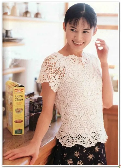 На мой придирчивый взгляд. Красота этой кофточки — в легкости, нежности, воздушности. Не так ли? Но слишком грубое и ярко-белое нижнее белье сводит на нет все прелести этой кофточки. Я бы надела под неё или только гладкий бюстгальтер телесного цвета, или, если есть комплексы по поводу излишней прозрачности, — очень тонкую, очень открытую, на тоненьких бретельках облегающую маечку телесного цвета. Из натурального или вискозного шелка.
