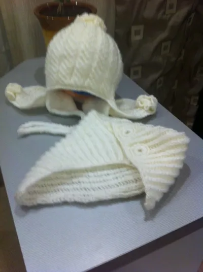Комплект из белой шапочки, снуда и митенок-варежек из пряжи Ализе Ангора голд в две нитки.