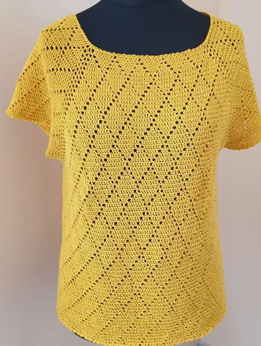 Топ связанный крючком узорами ромбы из пряжи Alize diva sylci effect.