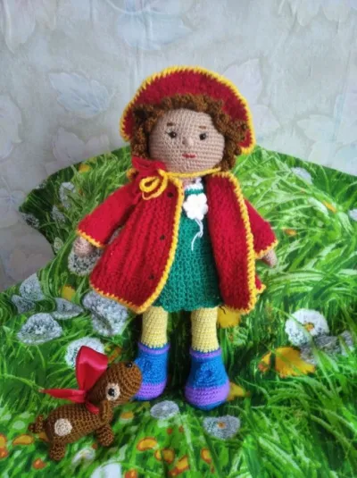 Связала ещё одну маленькую барышню для подарка. Пряжа - пехорка "детская" новинка, на обувку и одежку пошли клубочки - остатки, пальто и шляпку связала из кавказской пряжи спицами. Крючок №3, 3.5. Спицы №3.5. Глазки у малышки, у собачки глазки и носик - полу бусинки.