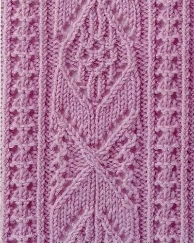 Раппорт узора состоит из 26 петель + 2 кромочные. Вязание узора начинаем после первого установочного ряда (0-й ряд). 0 (лицевой) ряд: 1 кром., 2 лиц., 2 изн., 4 лиц., 2 изн., 2 лиц., 1 изн., 2 лиц., ...