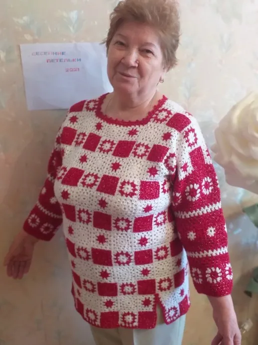 Перебирала я свои "закрома" пряжи и нашла два моточка красной пряжи с люрексом. Пряже этой больше тридцати лет. Захотелось мне ее пристроить. Нашла подходящую белую пряжу , выбрала мотив и решила поучаствовать в конкурсе " ВЕСЕННИЕ ПЕТЕЛЬКИ 2021" Вязала с удовольствием, надеюсь и носить буду тоже с удовольствием! Когда начала вязать, у меня не было четкого плана, какая это будет модель. Когда поняла, что белых ниток не хватит на всю кофточку, придумала рисунок для рукавов, где больше красной пряжи. Вязала сразу два рукава, пряжу использовала до последней ниточки. Выставляю на ваш суд мою кофточку, которую я назвала "Весеннее настроение"