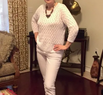 Чудесный джемперок на отличной фигуре! Даже белый цвет не полнит, рисунок удачно удлиняет