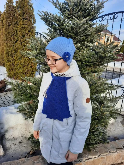 Шапочка и шарфик связаны из Пехорской пряжи "Австралийский меринос" (95% мериносовая шерсть, 5% леакрил; 100гр/400 м) на вязальной машине на плотности "6", а ажурный шарфик связан на плотности "8". Цветок связан крючком и пришит к шапочке красивой пуговкой в серединку.