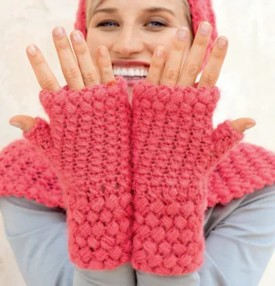 Выполнить начальную цепочку из 39 в.п., замкнуть в кольцо с помощью 1 соед. ст. и связать 6 круг.р. узором «Шишечки», при этом после 4-го круг.р. еще 1 раз повторить 3-й и 4-й круг.р. схемы. Затем вязать скрещенными ст. с/н. Через 6 см от начала выполнения скрещенных ст. с/н пропустить 7 п. для отверстия для большого пальца и связать вместо них 7 в.п. В следующем круг.р. обвязать эти в.п. скрещенными ст. с/н. Через следующие 4 см от отверстия для большого пальца провязать 2 круг.р. узором «Шишечки» и работу закончить.