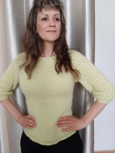 Приветствую всех мастериц!!!! Представляю свою работу из пуха норки.Джемперок вязала на спицах№3.Ушло 4мотка по 50гр.длина нити в мотке 350м.(80 процентов пух норки и 20полиамид).Связан регланом сверху,рукав 3/4.Джемперок очень нежный и пушистый!Всем здоровья и успехов!