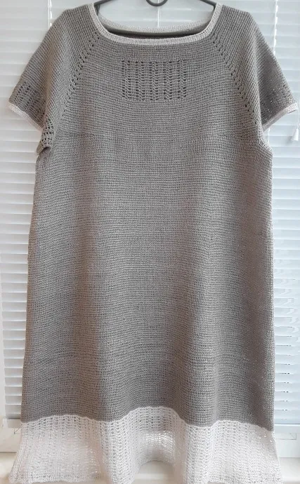 > Заказала на платье 850 гр пряжи)) , напомню -израсходовала 425 !Очень понравился серо-бежевый цвет , но его было всего 350 гр . Решила вязать этим цветом пока не закончится , было любопытно , на какую длину платья хватит .
