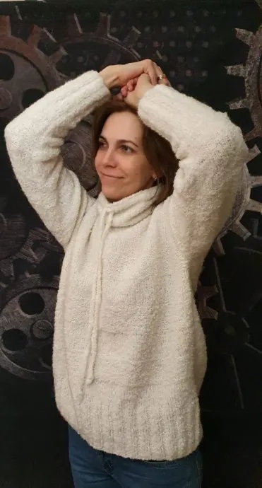 Худи связан из полтора мотка этой кудрявой нити. Состав смесовый. Спицы 4 и 3. Рисунок простой, т к из такой пряжи что-то сложное ни к чему. Плечо спущенное, модель оверсайз.