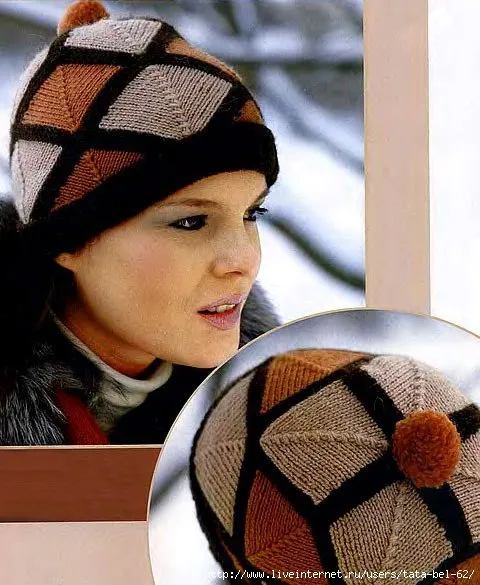 Сшить ромбы между собой по сторонам аб, ав, вг (см. схему). На открытых петлях полуромбов спицами № 2,5 черной пряжей вязать резинку 2 х 2 высотой 8 см. Закрыть петли и сделать отворот. Выполнить помпон из пряжи кирпичного цвета и пришить его.