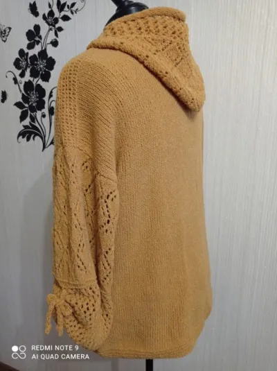 Представляю на ваш суд свою новою работу. Худи горчичного цвета. Связан из итальянской стоковой буклированной пряжи. 600м в 100гр. Вес готового изделия 425 гр. Размер 50-52. Вязала вкруговую. Почему-то мне очень понравилось так вязать. Быстрее, что-ли, получается.