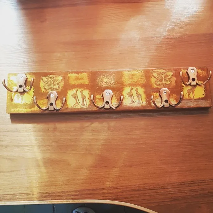 Работа была сделана из куска фанеры, набора крючков и декупажной карты. Финишем использовался яхтный лак.