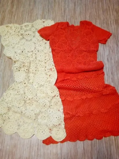 крючком. Белое платье хлопок с люрексом, оранжевое хлопок российского производства. вязала сама по картинке, без описания Вязание без швов по кругу. Меняла только по ходу вязания для приталивания размер крючка.