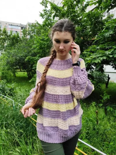 Мой пуловер я решила сделать более веселым, весенним и связать его трехцветным, разбавляя лавандовый цвет персиковым и лимонным. Вязала я пуловер примерно 3 недели, увидела сообщение о конкурсе где-то в конце апреля (куда я смотрела?). Первоначально хотела связать мужу весенний пуловер из хлопка. Но, увидев этот пуловер, решила, что для весеннего конкурса он подходит как нельзя кстати. Думала и мужской связать на конкурс, но уже просто не хватило времени и так запрыгиваю в последний вагон. Моделью для фото служила моя дочь, спасибо ей за терпение).