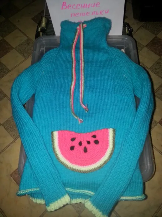 … Все-таки переделаю низ спереди на пару см резинки так, как на рукавах и арбузный карман придется пришить ровнее. Вживую он правда лучше выглядит :), а здесь даже цвет отличается. Из-за вспышки видимо.