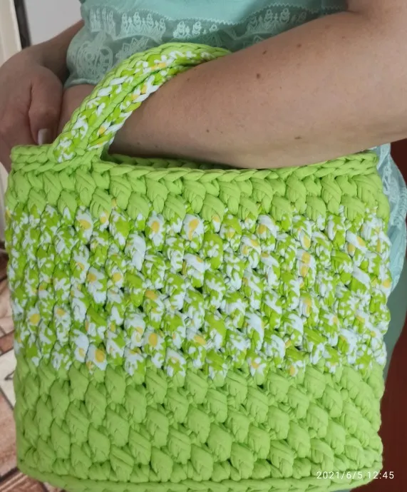 Добрый день, дорогие рукодельницы! Вчера закончила вязать сумочку-корзинку. Пряжа трикотажная Бисквит, цвета Лайм и Ромашка. Хочу взять ее в отпуск! Не определилась ещё, вязать в нее подклад или нет. Как думаете?