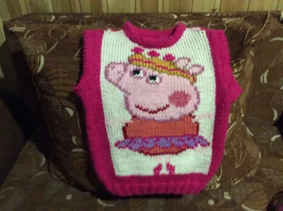 Недавно связала для внучки жилетик с её любимой свинкой Пеппа. Схему нашла в интернете, вязала в технике интарсия, мелкие элементы потом вышивала.