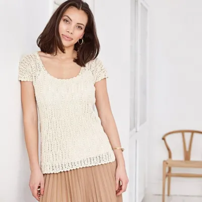 Модель с большим круглым вырезом демонстрирует потрясающий ажурный узор, который сразу бросается в глаза.