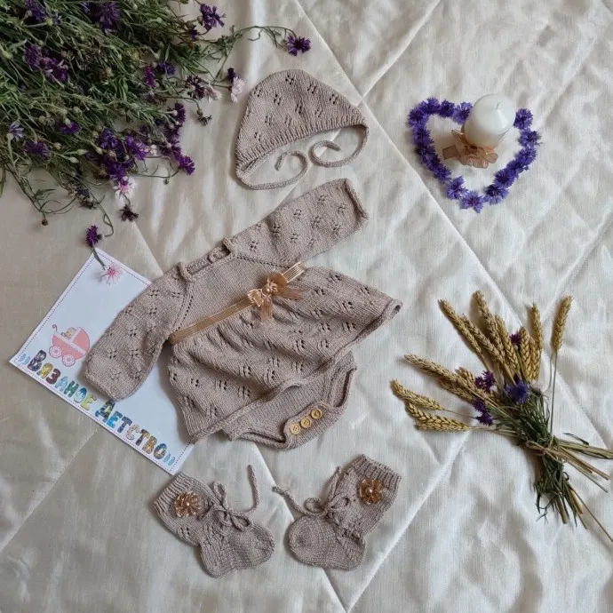 Добрый день! Представляю вашему вниманию очередную работу на конкурс "Вязаное детство". На этот раз связался комплект "Василек". В него входят анатомический чепчик, гольфики на шнурочках и боди-платье, который является удобным современным видом одежды для малышей. Вязалось боди-платье регланом сверху,без швов, по кругу. Между ножек удобная застежка на пуговицах. Бобинная пряжа, используемая для проекта, имеет натуральный состав - хлопок 100%, на спицах №3.5. Комплект подойдет маленькой принцессе 3-6 месяцев.