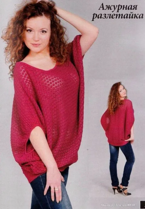 Сборка: выполнить плечевые и боковые швы. По нижнему краю изделия набрать на спицы петли и вязать резинкой 1 на 1. На высоте 7 см от наборного края закрыть все петли. По наборным краям рукавов набрать на спицы петли (в первом ряду равномерно по ширине полотна убавить 60 петель) и вязать лицевой гладью, в высоту выполнить 4 ряда и закрыть все петли, сложить вдвое и пришить с изнаночной стороны. По краю горловины набрать на спицы петли и вязать лицевой гладью, в высоту выполнить 4 ряда, сложить вдвое и пришить с изнаночной стороны.