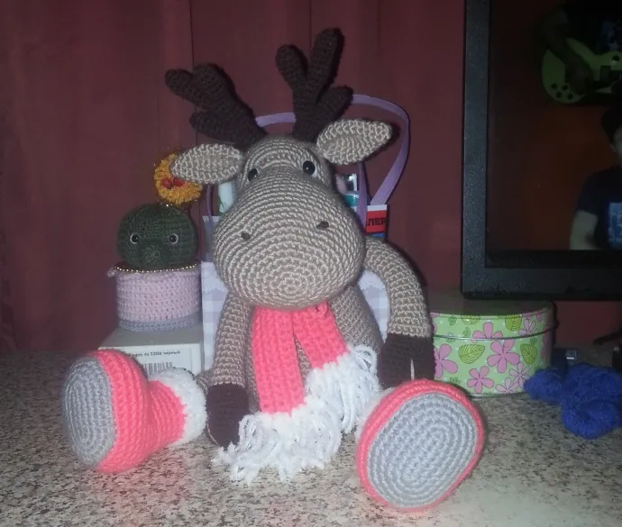 Коллеги :) , до Нового года ещё достаточно времени, и если кто-то давно хотел попробовать себя в вязании игрушек, то вот вам знак/мотивация! Потихоньку и с удовольствием можно сделать такую прикольную зверюшку. Нашла его подробное описание на просторах интернета, ссылка на мастер-класс ниже. Я чуть-чуть изменила, так как не хватило ниток на шее, поэтому шарфик у меня несъёмный+ добавила язычок и хвостик. К сожалению остались только тёмные фотографии- плохо видны рожки, просто его сразу уволок 36-летний мальчик, буквально из-под крючка. Взял в руки и сказал: всё, это моё!)) В общем- вяжите с удовольствием, радуйте друзей, близких или себя. А почему бы и нет? :)