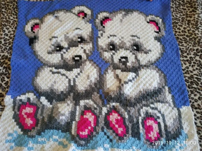 Начну с самой моей любимой работы - плед "Медвежата". В молодости я вышивала такую подушечку, которую подарила ребенку соседки. Вручную перерисовывала схему, которую благополучно потеряла. И вот, гуляя по просторам интернета, наткнулась я на них, срочно-обморочно заказала пряжу. Ожидание пряжи мне показалось вечностью, хотя она шла всего 5 дней. Получила и сразу же начала вязать. Вот что у меня получилось.