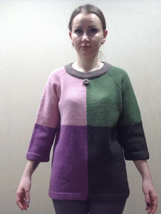 Спасибо! Начала вязать с двух клубков светлых зеленого и розового( по кругу не получилось т. к. Ряды должны быть поворотными) когда линию реглана закончила- перешла на темные оттенки. Спереди пришлось потом зашить.