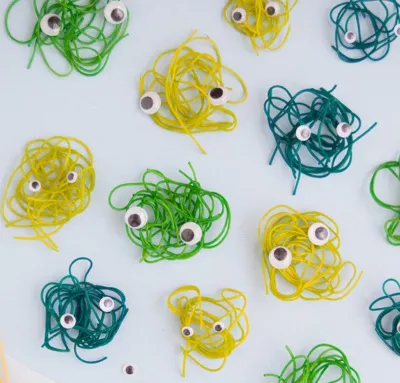 Когда спагетти полностью высохнут и станут твердыми, с помощью белого клея прикрепите к каждой из них глазки-гугли. Вы можете даже вырезать из строительной бумаги или фетра дополнительные элементы, такие как брови, носы и рты, чтобы придать им различные выражения!
