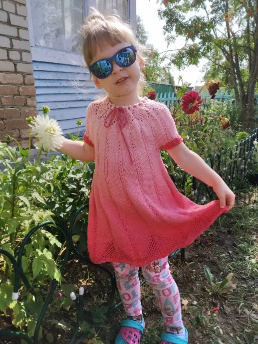 Доброго времени суток, дорогие рукодельницы! Представляю на ваш суд платье для девочки 3-х лет, на рост 104. Название платью выбирали всем миром, внучка сказала последнее слово: " Я люблю розовый зефир!". Платье связано из ниток от alize, siky effect DIVA OMBRE BATIK, цвет 7381. И внучка и её мама остались очень довольны платьем, внучка с радостью одевает его в садик и всем хвастается, что связала ей платьице бабушка. Это самая лучшая награда за мой труд. Кокетка связана крючком №3, остальное спицами №3.