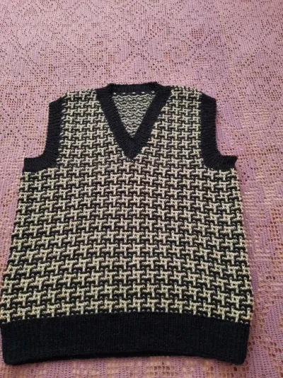 А теперь о самом изделии - жилет связан спицами N 3 в технике "ленивый жаккард" из Итальянской пряжи FILATURA DI CROSA INCA WOOL (40% альпака, 35% натуральная шерсть, 25% акрил; 50гр/200м). На размер 42 пошло 100гр пряжи белого цвета и около 150гр пряжи темно синего цвета.