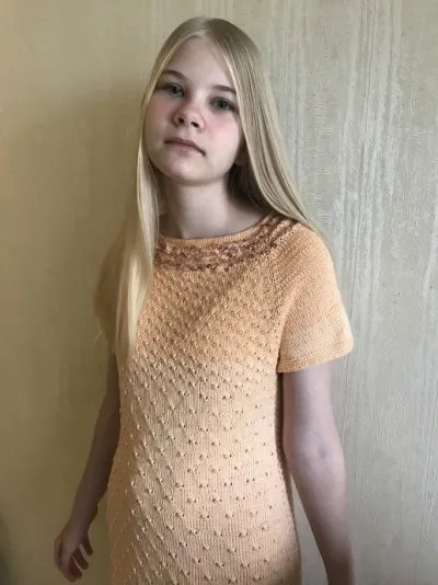 Платье для девочки-подростка выполнено из хлопковой пряжи и пряжи с пайетками, спицами номер 2; 2,5. В работе использовался крючок номер 2.