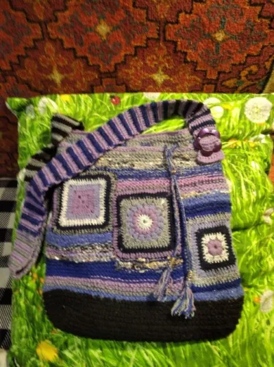 Здравствуйте, уважаемые коллеги по спицам и крючкам. Связала сумку из остатков ниток, в ход пошла и кавказская пряжа, и ... всякое разное. Квадратные мотивы и донышко, а так же отделку вязала крючком №4. Спицы №3.5. Сшила подклад с кармашками, вшила молнию.