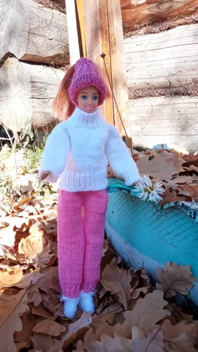 Моя Барби выгуляла новый костюм! Шапочка "Пальма" связана из старинных ещё советских ниток 781м/100г в 2 нитки спицами №2, остальное из пехорки детская новинка, 200м/50г спицами №2, но эти нитки очень толстые для кукольных нарядов, на такой костюм подошли, но платье из них вязать не буду. Ботинки украсила травкой. Дети любят одевать и раздевать куколок, поэтому пришлось вязать чуть большего размера, чтобы удобней снимать и одевать, но до оверсайза не дотягивает, вот как то так получилось.